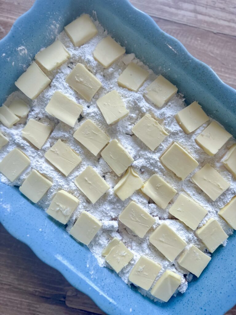 Sprinkle the butter cake mix evenly over the top. Add the 1 cup of butter evenly across the top.