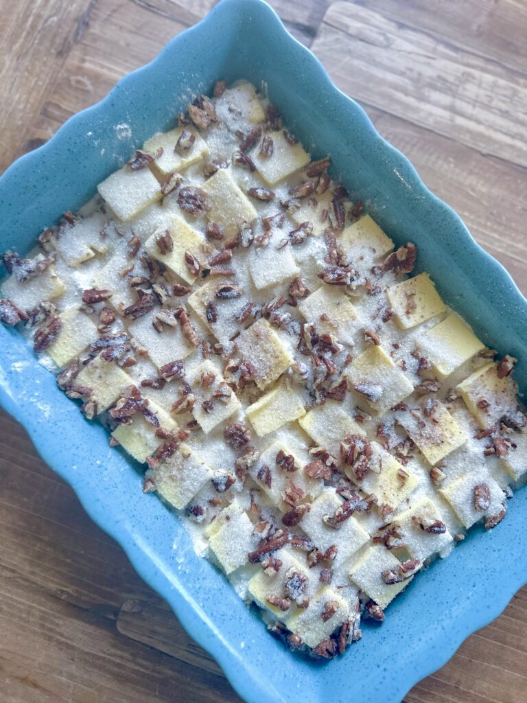 Last top it with pecans and the other 1/4 cup sugar. Bake at 375 for 45 minutes to an hour or until golden brown on top.